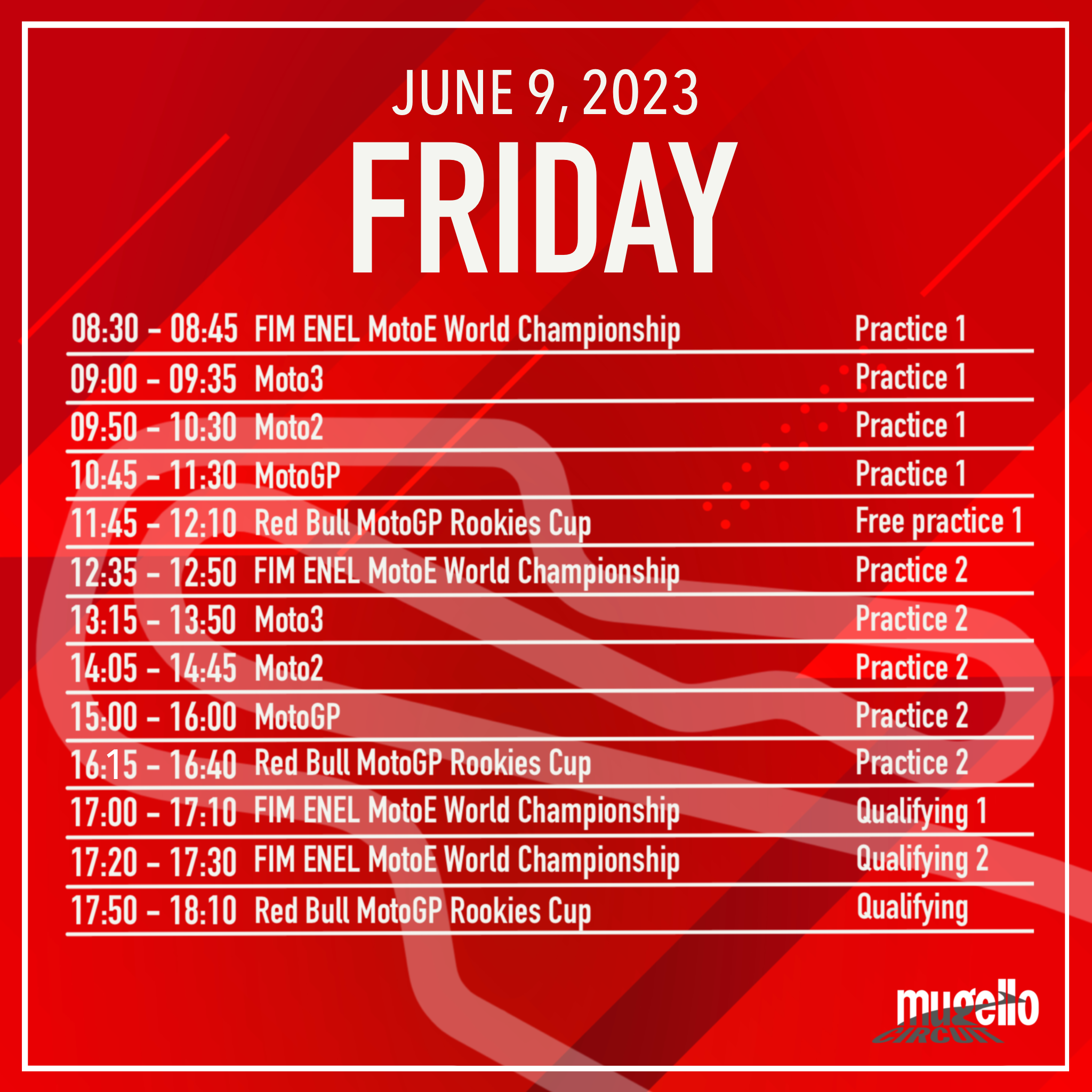 Tanti gli appuntamenti a partire dalla Sprint Race alle 15:00, a seguire l’incontro con i piloti sul palco del Correntaio e DJ Set con Hell Raton. Per gli amanti del calcio sarà possibile seguire la Finale di Champions League sui maxi schermi e poi ancora il Mugello ballerà per scaldare l’atmosfera in vista della gara, saliranno in consolle: Simone Quai, Alex The Voice, Geo From Hell e si chiuderà in bellezza con le note di DJ Ralf! Al Mugello tutto è possibile!